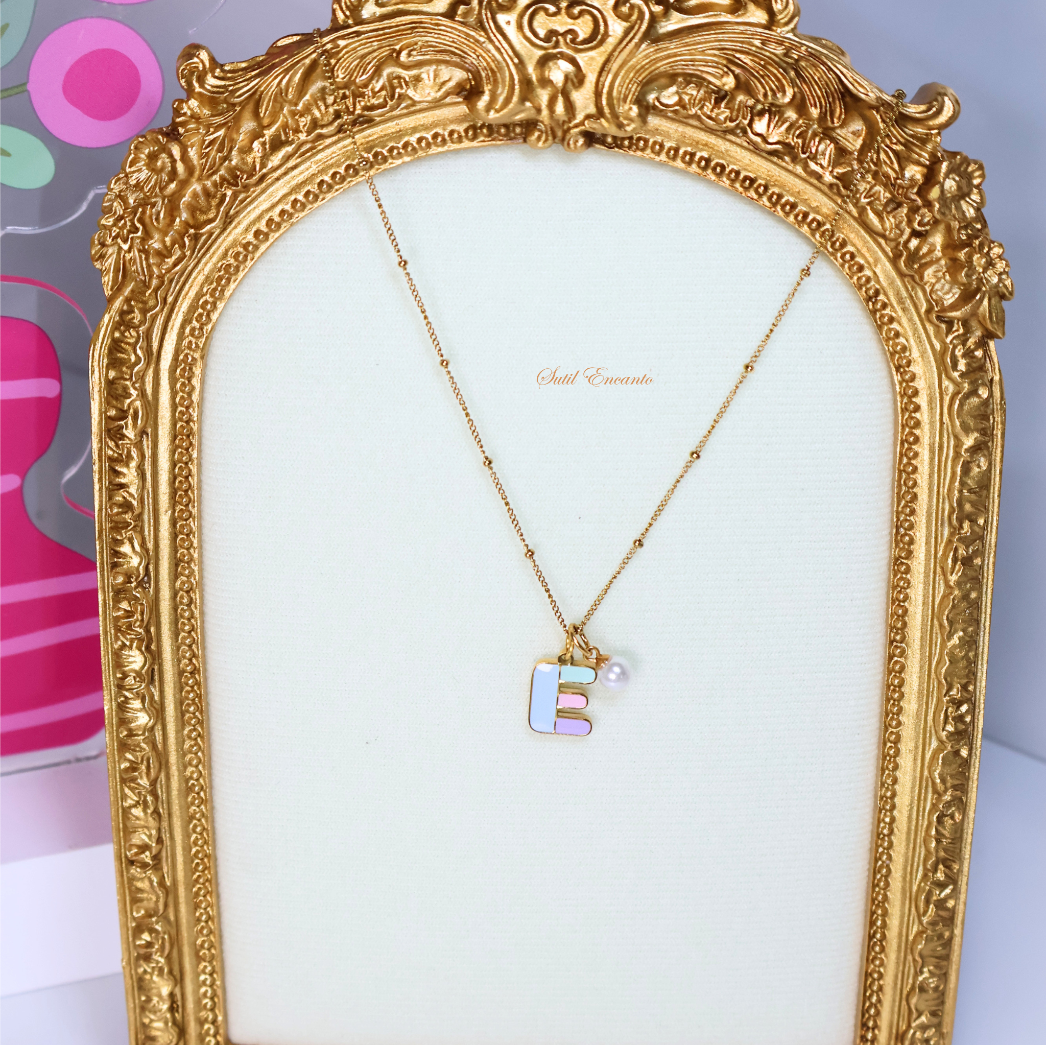 Collar con la inicial E Material: Stainless Steel 316 (waterproof) Medidas: 16″ collar con extensor 18”