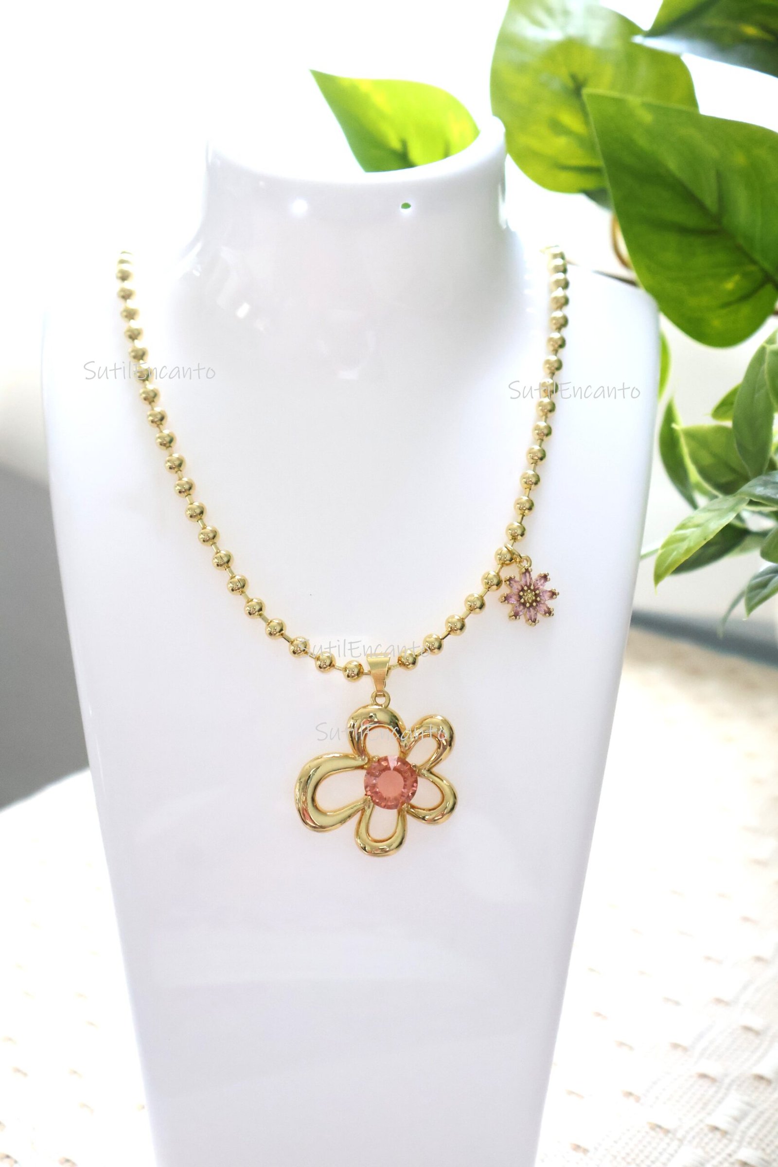 Collar con un colgante en forma de Flor y una piedra color Rosa