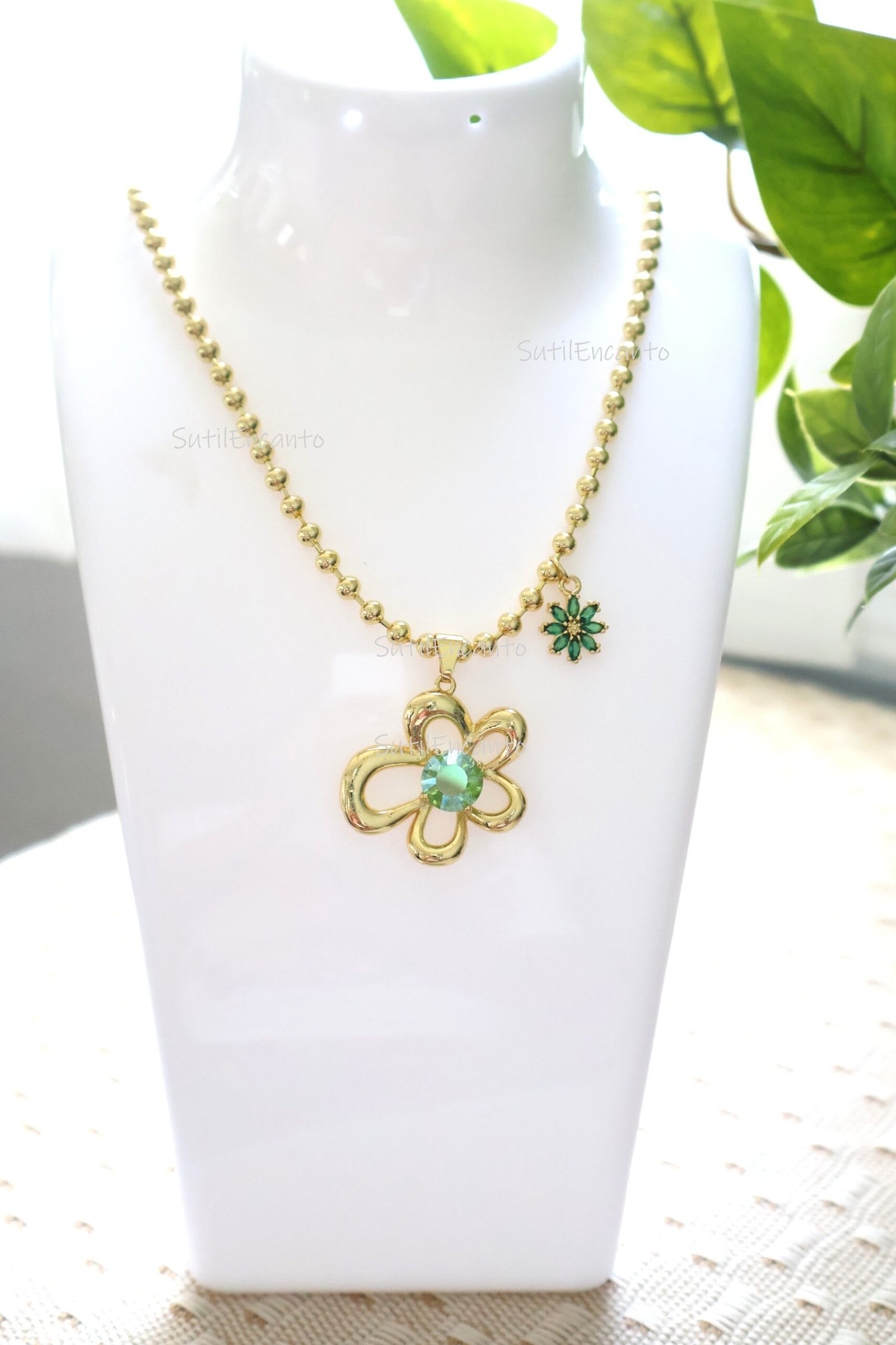 Collar con un colgante en forma de Flor y una piedra color Verde