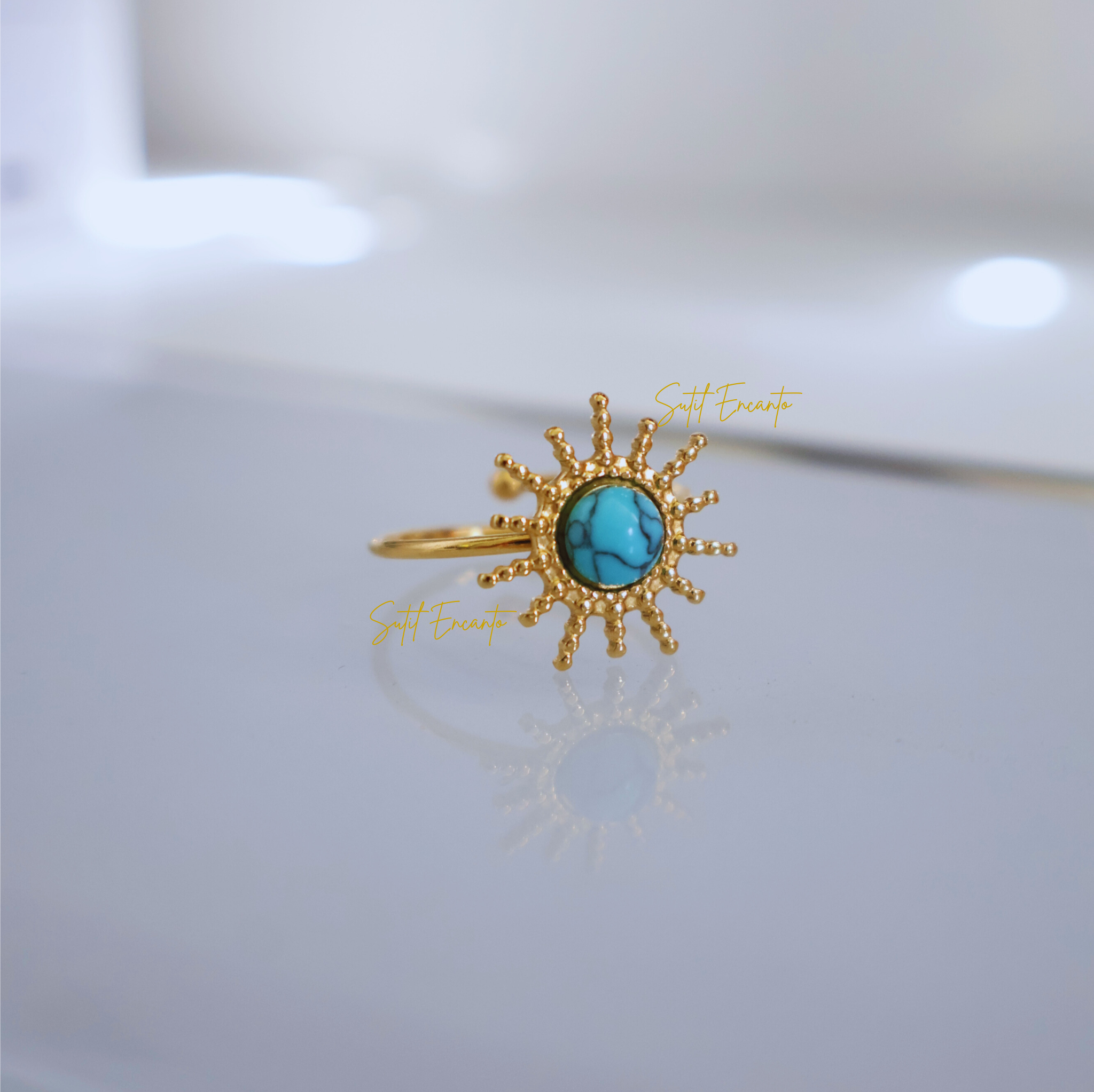 Sortija con una piedra azul rodiada de destellos